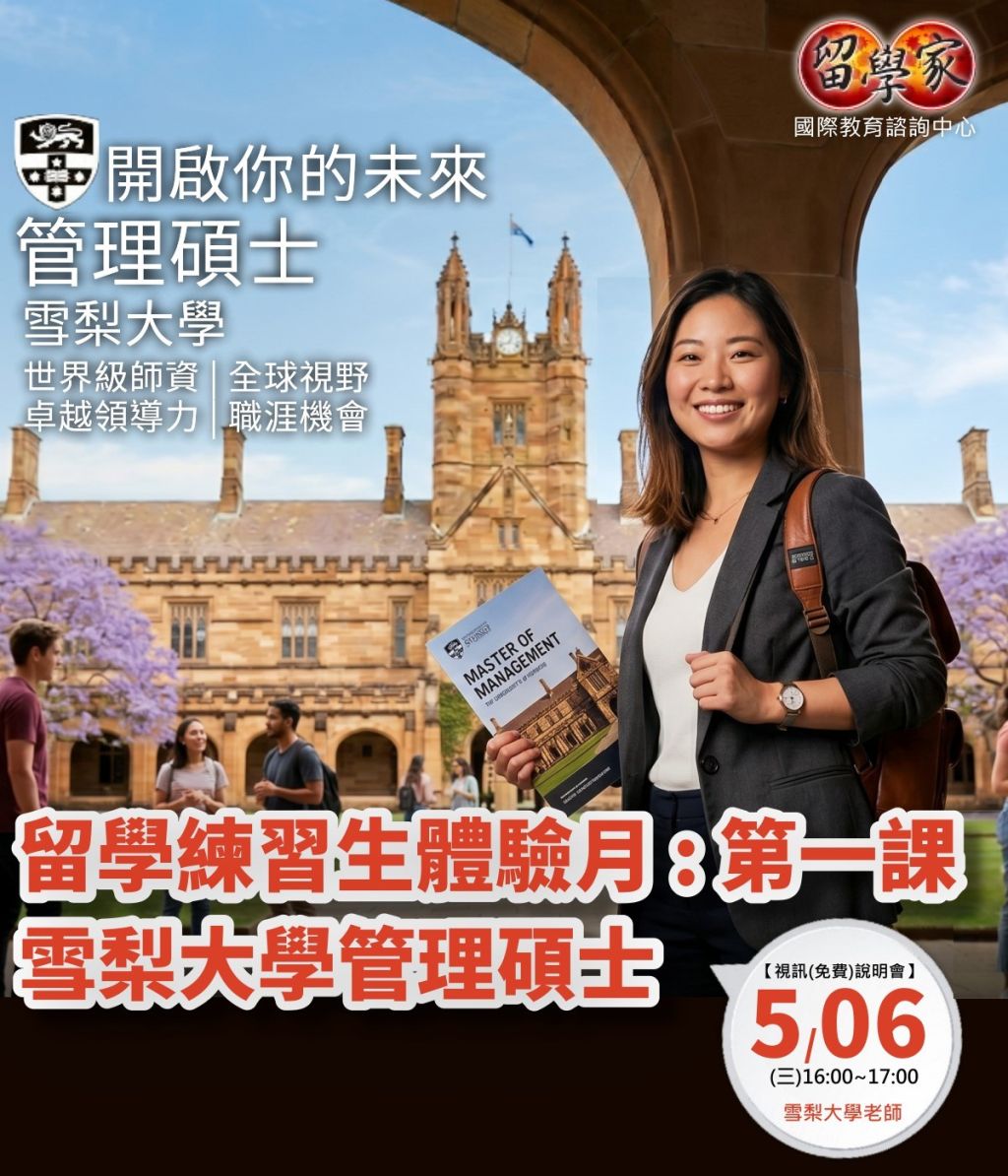 想在商務核心領域發光發熱,卻不知道從何開始? 渴望在策略規劃與創新實踐中,找到屬於你的核心競爭力嗎? 作為「留學練習生體驗月」的重磅首發課,我們特別邀請到了 澳洲頂尖名校—雪梨大學 The University of Sydney 的老師親自上線!這不僅是一場說明會,更是你翻轉職涯視野的起點。 🎓 為什麼你不能錯過雪梨大學管理碩士 (Master of Management)? 雪梨大學的管理學課程在全球享有盛譽,專為追求卓越領導力的未來菁英設計: ✅實戰導向: 課程核心聚焦於解決「現實世界」的商業難題,拒絕空談理論。 ✅業界接軌: 提供大量與全球知名企業交流、實習的機會,讓你在學期間就建立強大的人脈網。 ✅全方位技能: 從前瞻的策略規劃到前衛的創新實踐,打造你不可替代的職場優勢。 ✅全球視野: 在世界級師資的引領下,與來自全球的優秀人才共同成長。 🕒 【說明會詳細資訊】 💡活動主題: 留學練習生體驗月:第一課 - 雪梨大學管理碩士 📅 活動時間: 5月6日 (三) 16:00 ~ 17:00 (台北時間) 🔗 活動方式: 線上視訊說明會 (全程免費) 📍 主講嘉賓: 雪梨大學老師 🔥 報名限時開放中! 這是一次與澳洲名校老師直接交流、掌握第一手留學資訊的絕佳機會。無論你是大學剛畢業,還是想透過進修轉換跑道的職場人士,這堂課都將為你指引方向。 開啟你的未來,從雪梨大學管理碩士開始! 我們線上見!