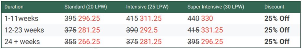 1-52 weeks + 25% + $175 registration fee waived with a 4-week registration 特殊注意事項: 1.只限於台灣居民 2.所有報價以國際註冊組發出的為正式依據 更新日期 : 2026/01/05
