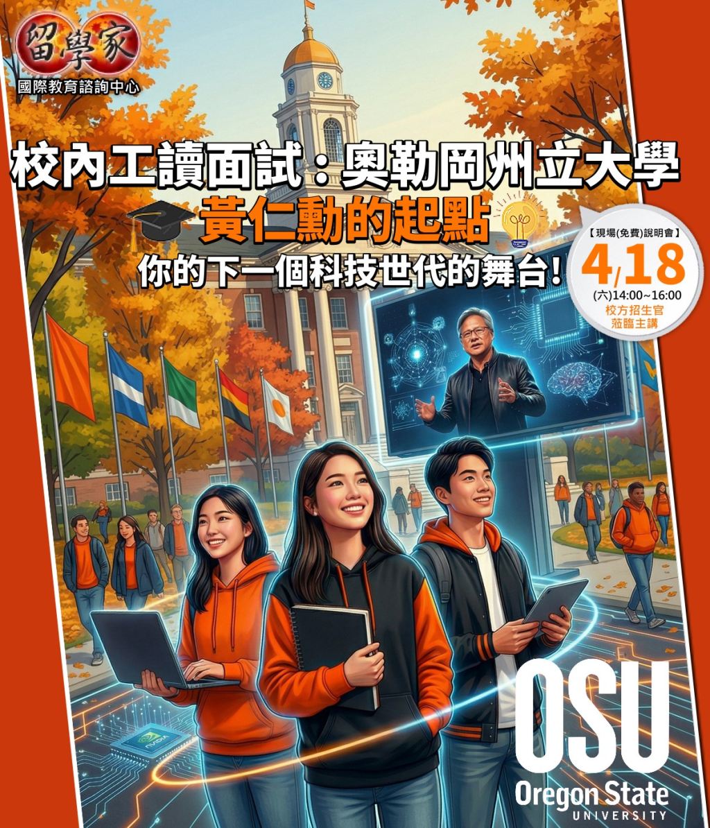 【前進 AI 巨頭的起點】4/18 奧勒岡州立大學校內工讀面試說明會 — 預約你的科技未來! 你想過嗎?NVIDIA 執行長黃仁勳的科技夢想,是從奧勒岡州立大學(OSU)起飛的。 現在,你有機會追隨大師的足跡!奧勒岡州立大學不僅是全美頂尖的研發型大學,更為國際學生提供豐富的校內工讀機會。這不僅是賺取生活津貼,更是進入美國科技產業圈的「實戰演練」。 為什麼你不能錯過這場說明會? ✅大師校友背書: 了解黃仁勳母校的強大學術資源與產業鏈結。 ✅校內工讀機會: 現場解析面試技巧,助你搶佔校內職缺,減輕留學負擔。 ✅職涯超前部署: 在校期間累積美國工作經驗,為未來的實習(OPT/CPT)打下基礎。 🏛️ 綜合排名 ◆ 全美綜合大學排名U.S. News第 143 名 ◆ 全球大學排名QS World Rankings第 624 名 ◆ 最有價值學校Best Value Schools奧勒岡州內排名第 1 🏛️ OSU 的工程學院 ◆ 是全美最大的工程學院之一,多項專業在《U.S. News》研究生排名中名列前茅: ◆ 人工智慧AI : 全美第 1 個提供跨學科 AI 研究生學位的大學 ◆ 電腦科學Computer Science : 全美授予 CS 學位數量最多的學校之一 ◆ 土木工程Civil Engineering : 全美第 43 。 ◆ 電腦工程Computer Engineering : 全美第 63 名 ◆ 環境工程Environmental Engineering : 全美第 23 名 ◆ 核能工程Nuclear Engineering : 穩定維持在全美前 15 名