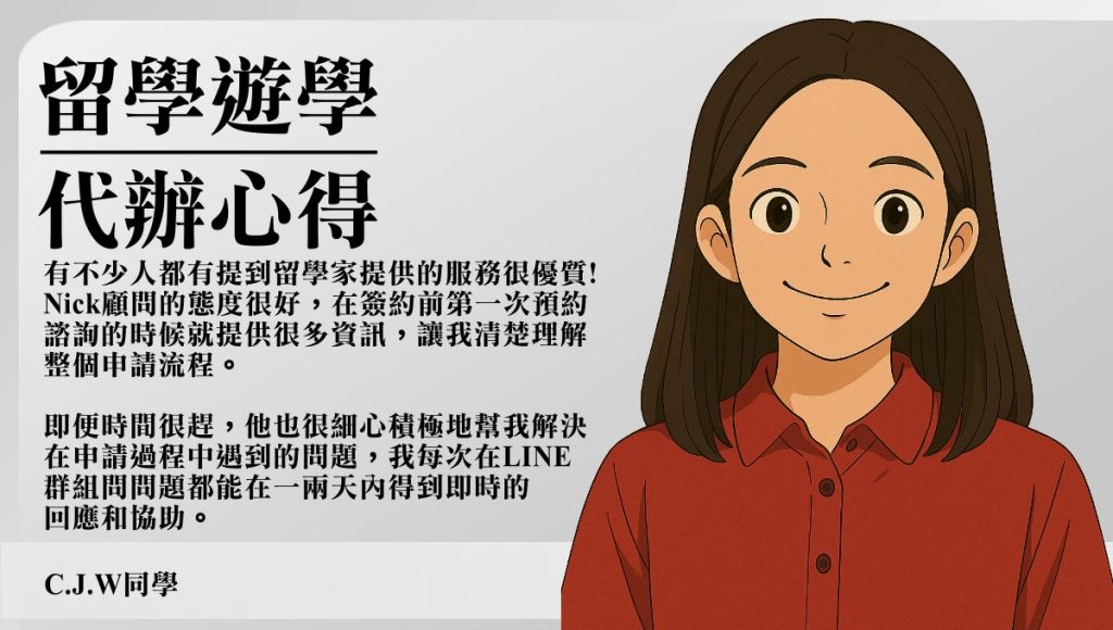 透過留學家的幫助,我終於得以實現出國唸書的夢想。我要特別感謝顧問Nick。...