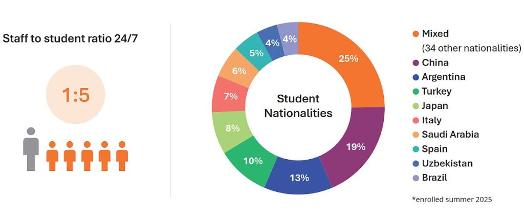 適合追求獨立生活,並希望與來自世界各地的國際學生一同體驗活力校園生活的學員。 年齡限制: 18 歲以上 房型: 獨立衛浴套房 膳食: 需自理(配備完善烹飪設施) 距離: 距離學校約 15-35 分鐘路程 設施: Wi-Fi、洗衣設備、健身房、24/7 全天候安保