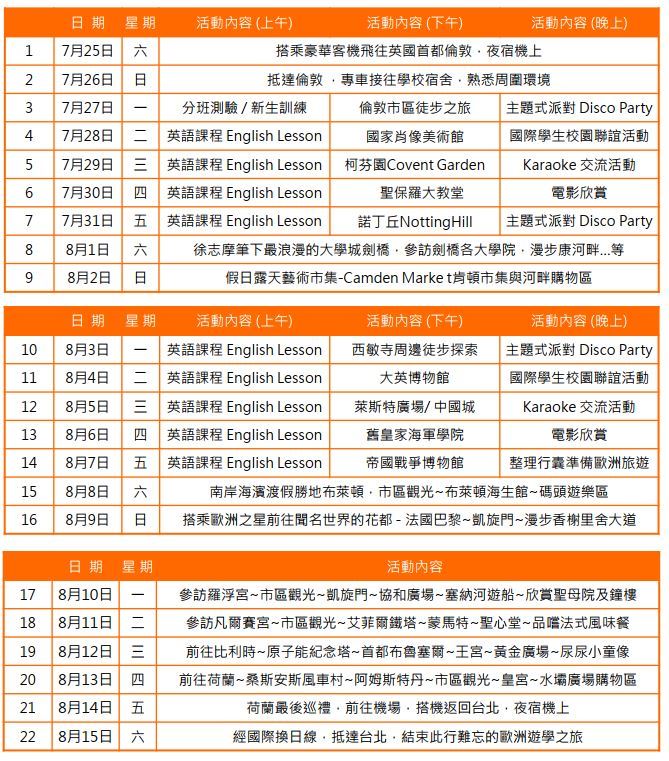 活動皆由學校安排當地外籍活動輔導員,帶領導覽英國各著名觀光景點,學員除了英文學習之外,亦在參訪觀光之餘,能更深入了解大英帝國的多元文化面貌。