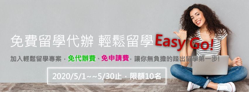 加入輕鬆留學專案,不但免代辦費,也不須繳交申請費,讓你無負擔的踏出留學第一步!