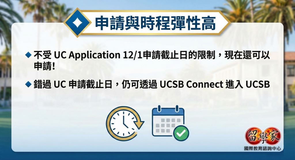 ◆ 錯過 UC 申請截止日,仍可透過 UCSB Connect 進入 UCSB