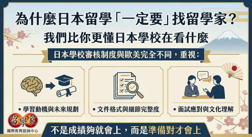日本學校審核制度與歐美完全不同,重視: ◆ 學習動機與未來規劃 ◆ 文件格式與細節完整度 ◆ 面試應對與文化理解 不是成績夠就會上,而是準備對才會上
