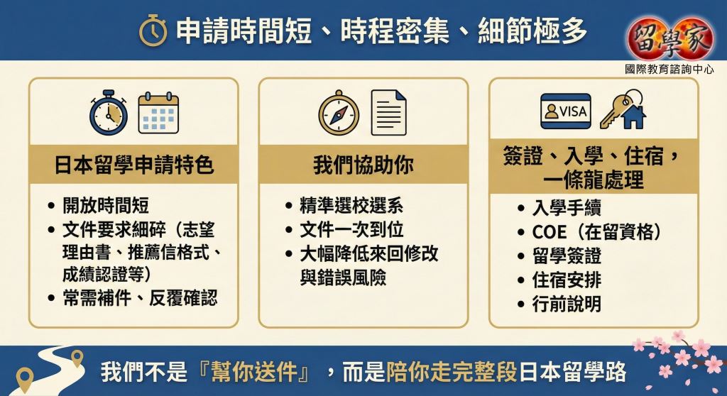 從錄取到出發,每一關都不能出錯: ◆ 入學手續 ◆ COE(在留資格) ◆ 留學簽證 ◆ 住宿安排 ◆ 行前說明 我們不是「幫你送件」,而是陪你走完整段日本留學路!