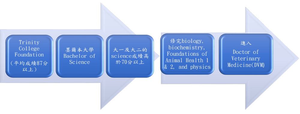 特別引人注目的是墨爾本大學有個特別為台灣高中畢業學生所規劃的學士後獸醫博士保證入學方案。台灣的高中畢業生,先申請進入Trinity College Foundation課程就讀,並維持畢業成績平均87分以上.完成Foundation後,直接進入墨爾本大學Bachelor of Science 就讀,選擇Animal Health and Disease major 佳;大一及大二的science相關科目成績必須達到70分以上,同時必須修完Biology, Biochemistry, Foundations of Animal Health 1 & 2, and physics,即可保證入學。