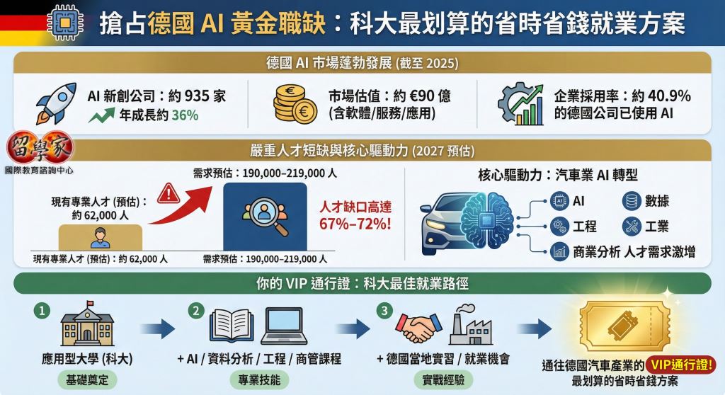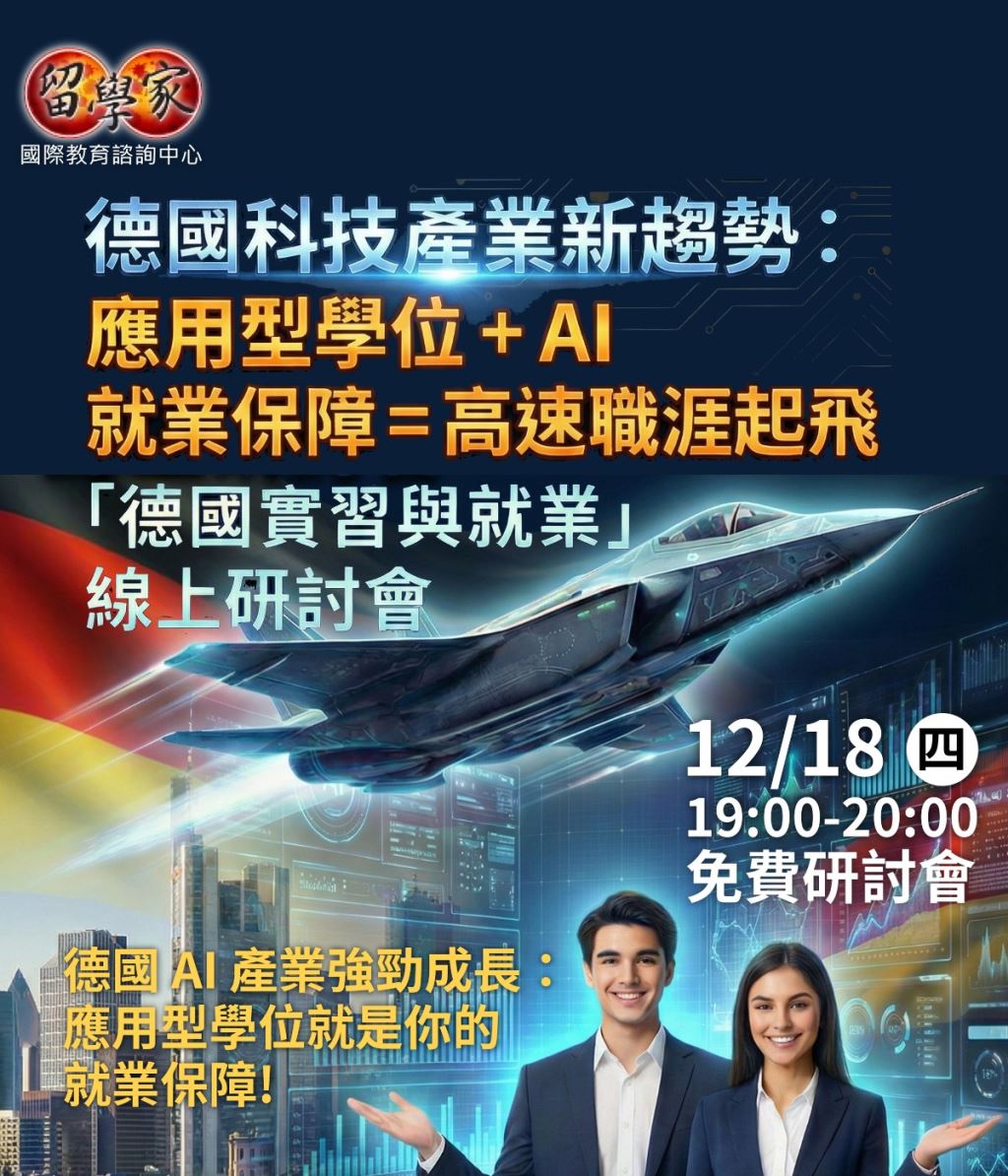 【德國實習與就業】線上研討會 德國科技產業新趨勢: 應用型學位 + AI 就業保障 = 高速職涯起飛! 德國 AI 產業強勁成長:應用型學位就是你的就業保障! 搶占德國 AI 黃金職缺:科大最划算的省時省錢就業方案 截至 2025 年,德國已有約 935 家 AI 新創公司。新創數量相比前一年年成長約 36%。德國 AI 市場 (包括 AI 軟體/服務/應用) 在 2025 年的估值約為 €90 億左右, 目前約 40.9% 的德國公司 已經在其商業或生產流程中使用 AI,德國已有大量 AI 新創與企業採用 AI,但面臨嚴重的人才短缺問題! 2027 年,預估 AI 專業人才約有 62,000 人,但預估需求會提升至 190,000–219,000 人,人才缺口高達 67%–72%。 更重要的是 : 德國汽車業正在大規模AI轉型, AI / 數據 /工程 /商業分析人才的需求激增。 「應用型大學 (科大) + AI/資料分析/工程/商管課程 + 德國當地實習/就業機會」,你通往德國汽車產業的 VIP 通行證就在這! ★日期:2025年12月18日(四) ★時間:19:00~20:00 ★說明會方式及地點:線上說明會 ★主講人:留學家資深專業顧問