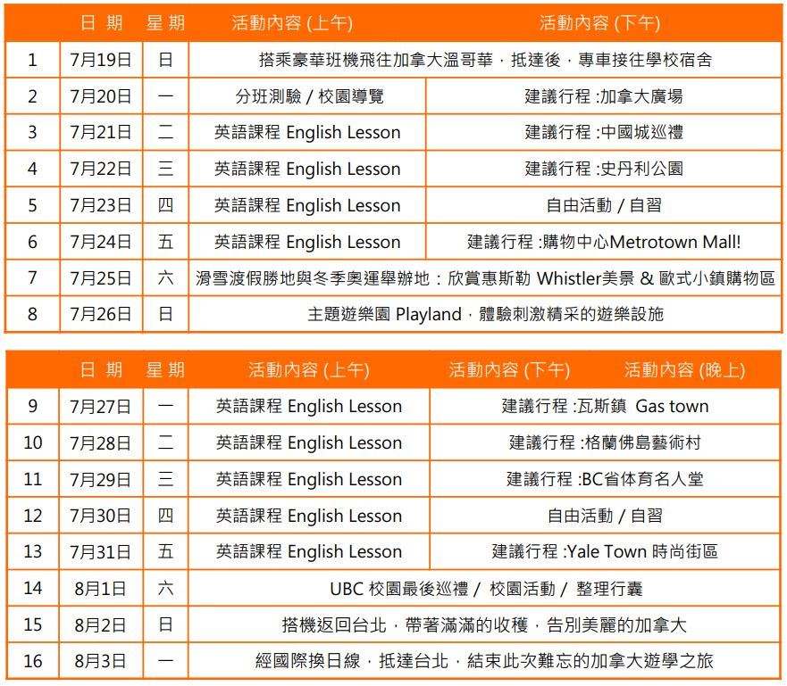食宿安排:UBC大學宿舍 (單人房),提供每日早晚兩餐
